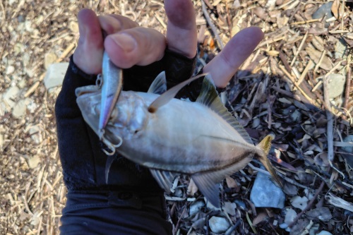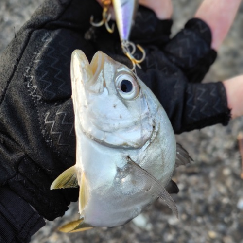 少し移動して以前夏終わりに良く釣れた場所へ…干潮前後で浅いのでどうかなと思ったけど、結構反応良い…けどバイトまでいかず、フッキングしても外れる、フッキングミスと全部取れたらそこそこの数やったのに…。