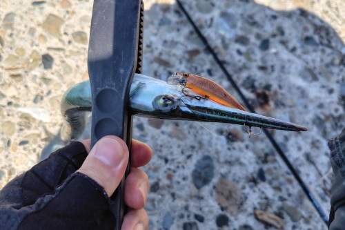 河口横のテトラ際をDコンタクト50で軽くトゥイッチしながらの1投目…